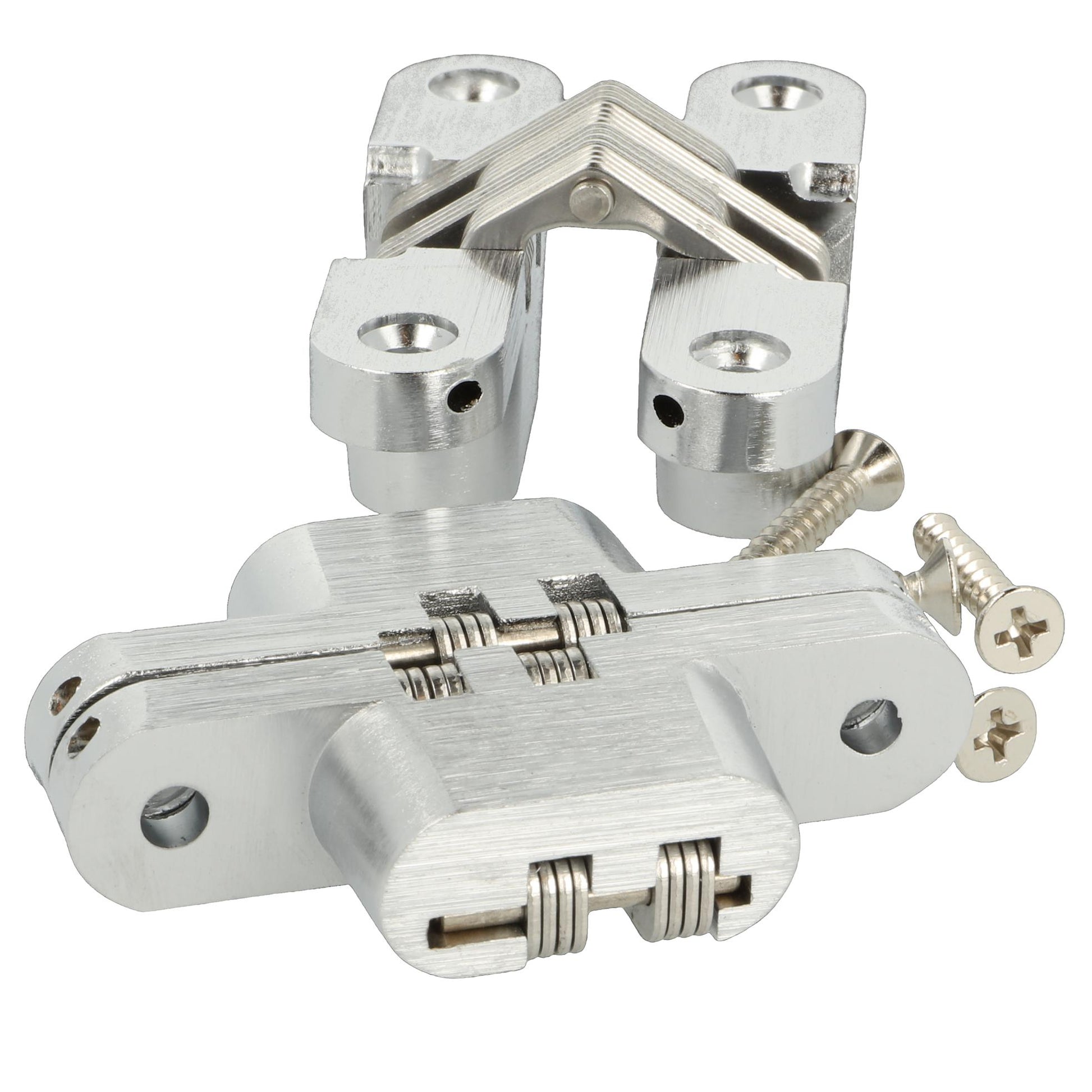Two high-quality invisible cross hinges, 70 x 16 mm, made of Zamak, with a stainless steel look, including screws. Concealed furniture hinge from UMAXO®, folds 180°. Hidden furniture hinge (vici hinge) for recessed installation.