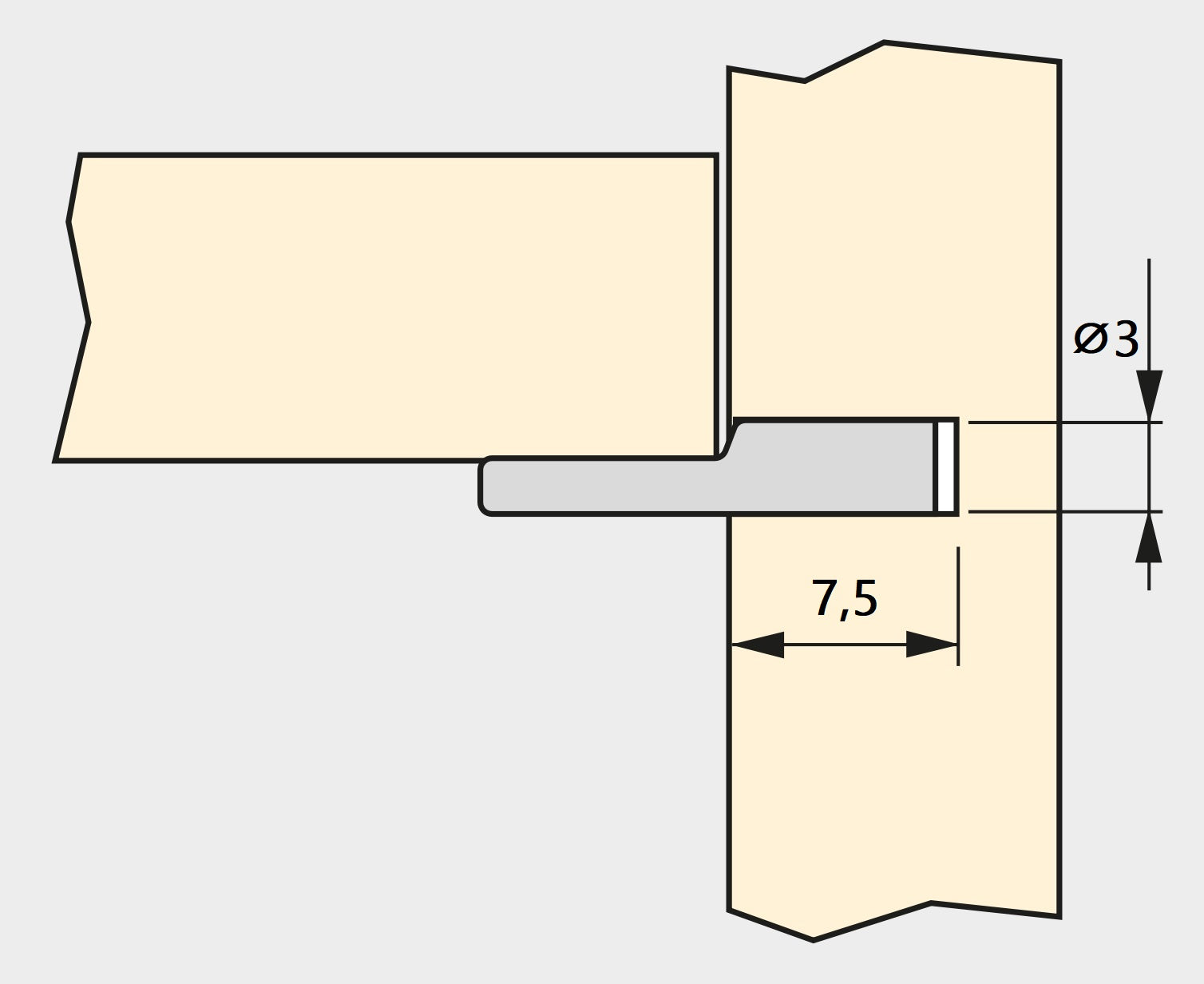 - The shelf support 8049707 is inserted into the pre-drilled mounting hole with a diameter of ⌀3 mm (1/8″) and a depth of at least 7.5 mm (19/64″) in the cabinet wall