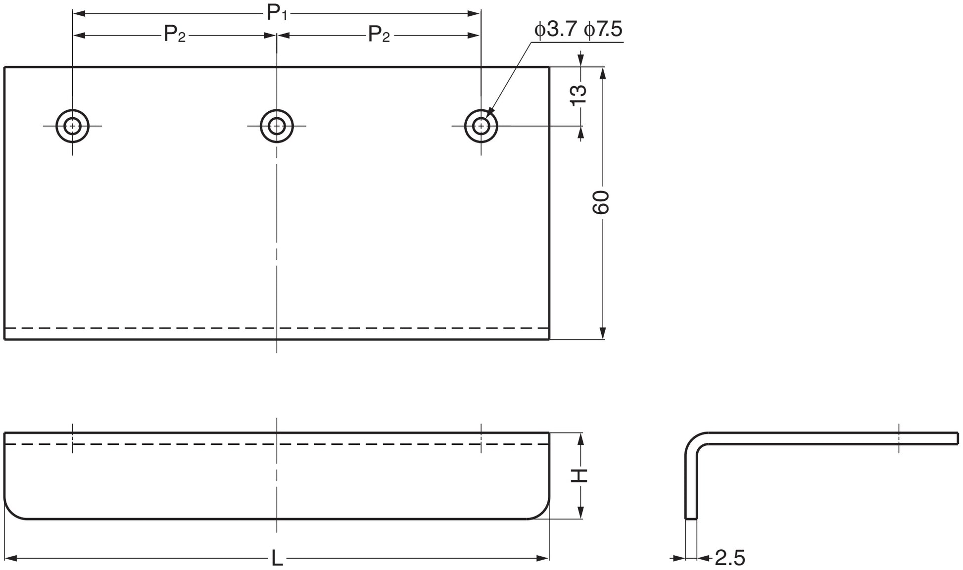 • Distance between mounting holes (P2): 57 mm (2-1/4″)