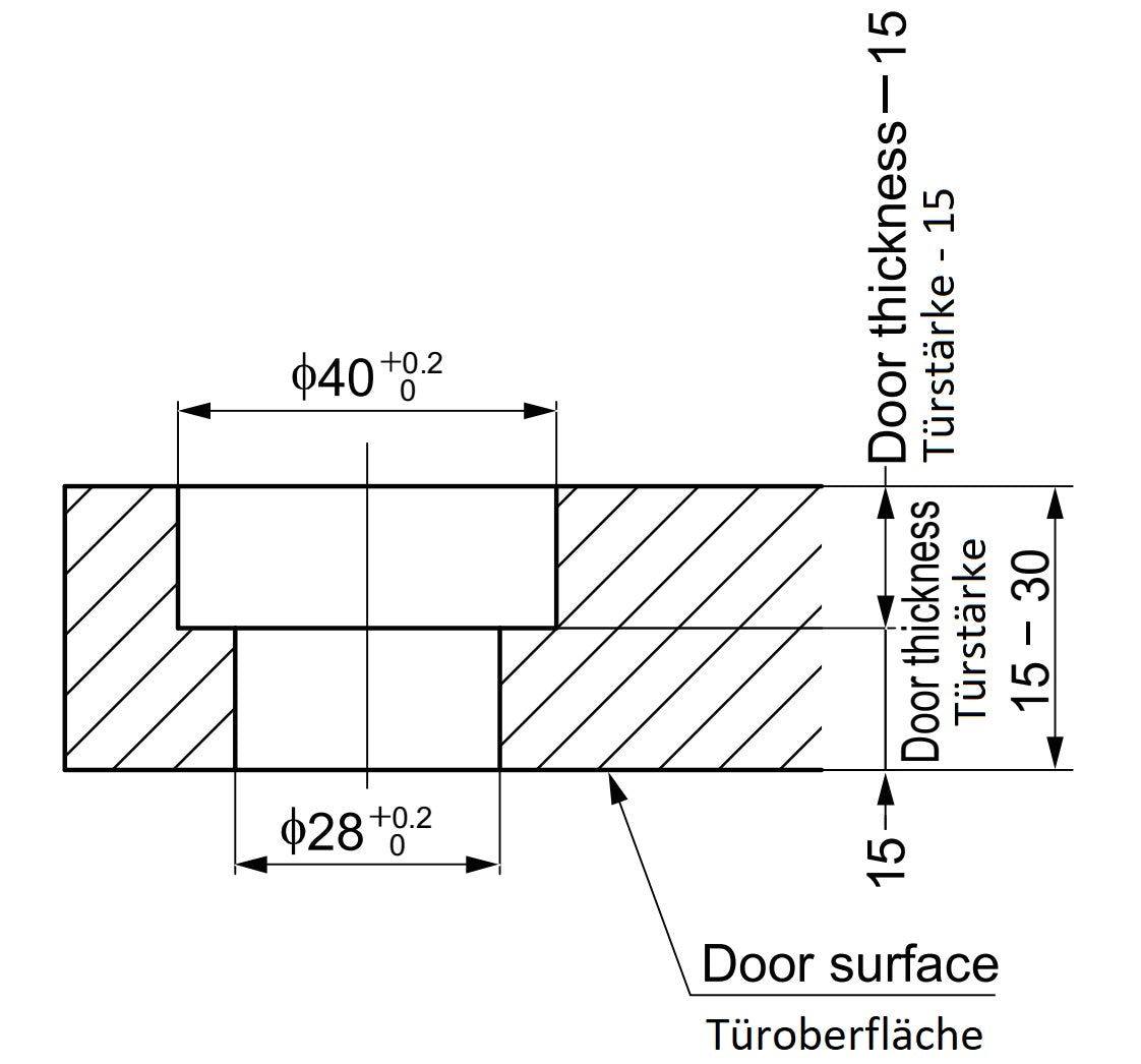• For mounting, a hole with a diameter of ⌀28 mm (1-7/64″) must be drilled in the front