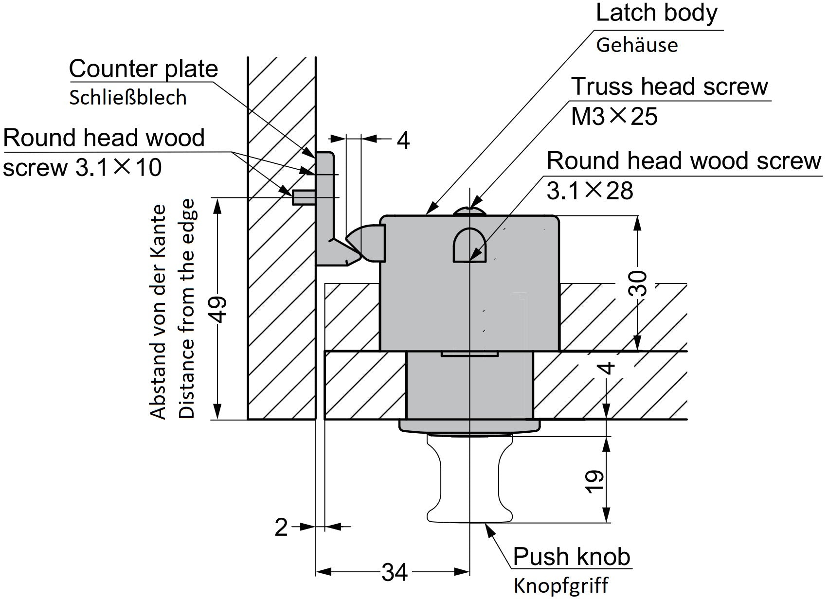 • The strike plate is then attached to the cabinet side using the supplied screws. The vertical distance between the door edge and the strike plate is 49 mm (1-59/64") (see assembly drawing for further details).