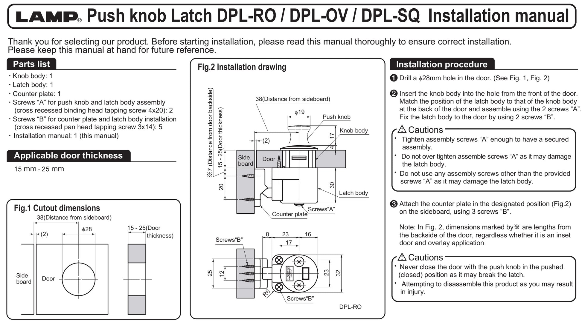 The DPL-OV-G push button is suitable for doors with a thickness of 15 mm (19/32") to 25 mm (63/64"). The high-quality DPL-OV-G push button fasteners are ideal for, among other things, the following:
