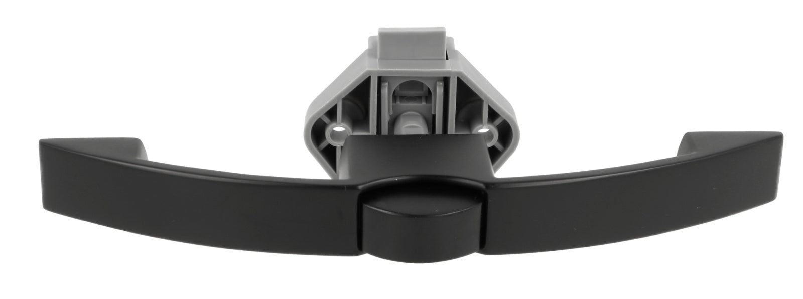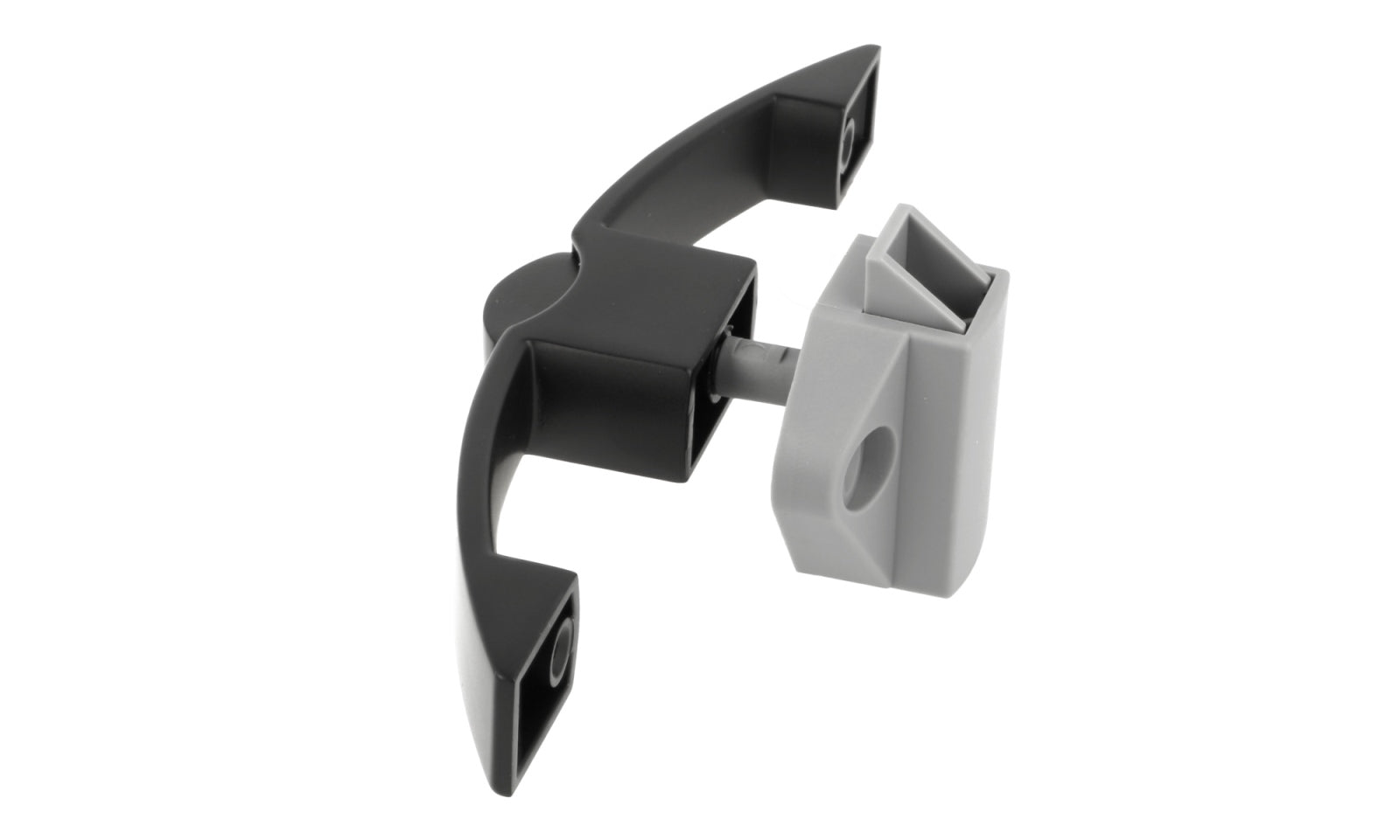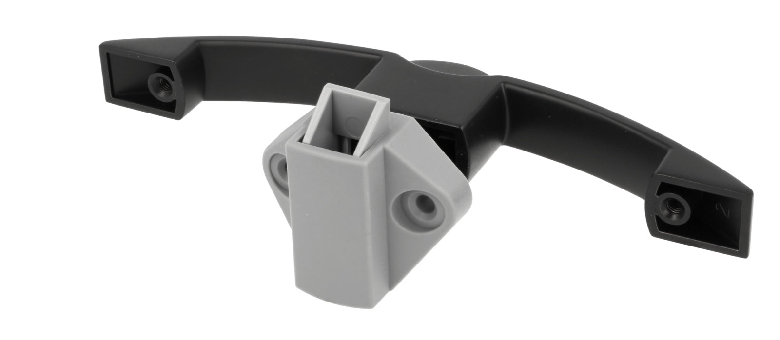 The special feature of the push-button handle 14.03.071-0 is that the counterpart (strike plate) features two spring-loaded buffers. When closing, these buffers ensure that the door closes gently and makes no noise during travel or flight.