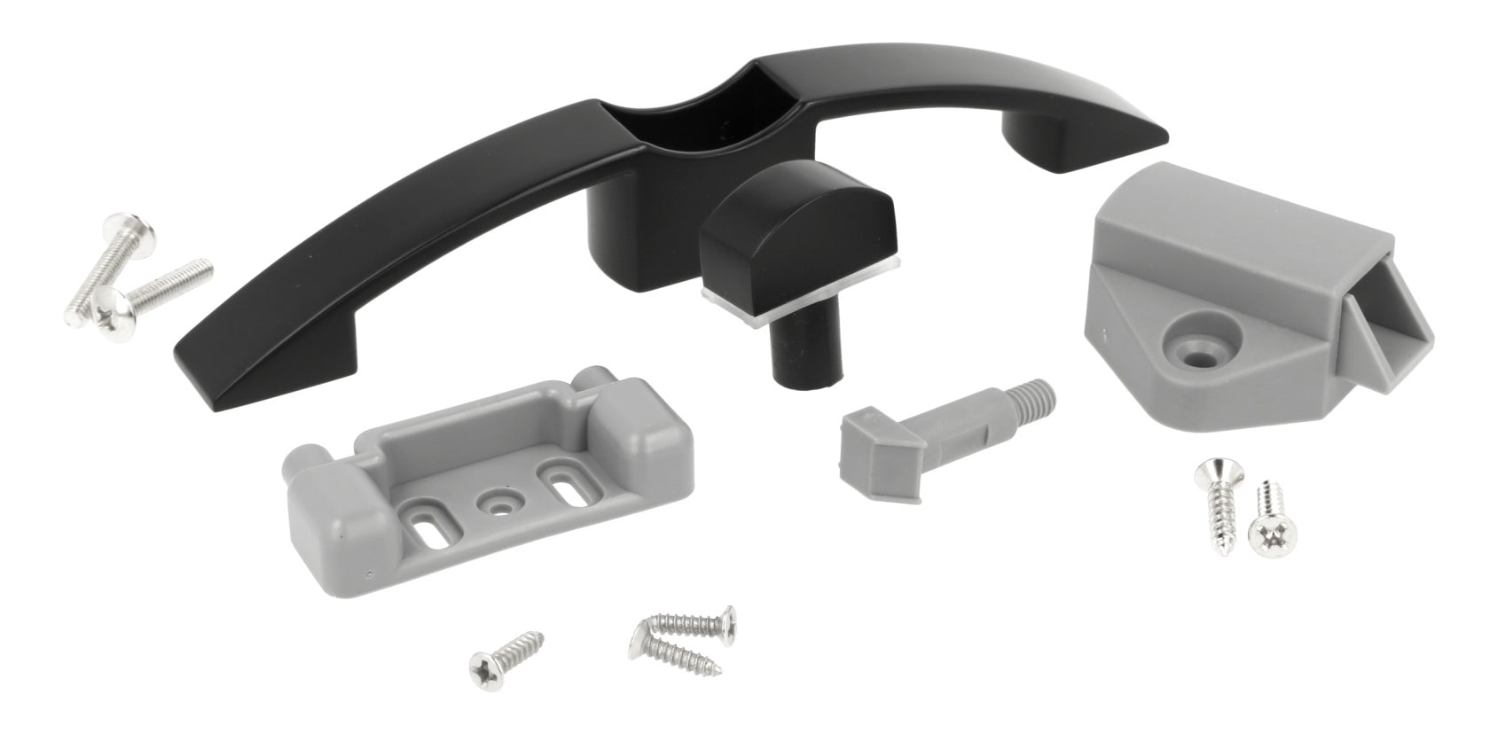 - The handle lock 14.03.071-0 is inserted into the front and the housing is screwed on from the back using the supplied screw