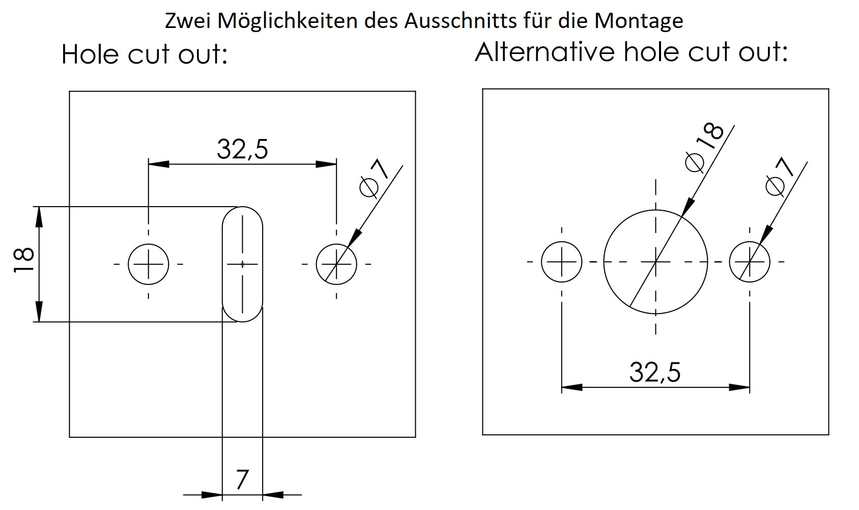 - For installation, a cutout with a height of 18 mm (45/64″) and a width of 7 mm must be made in the front