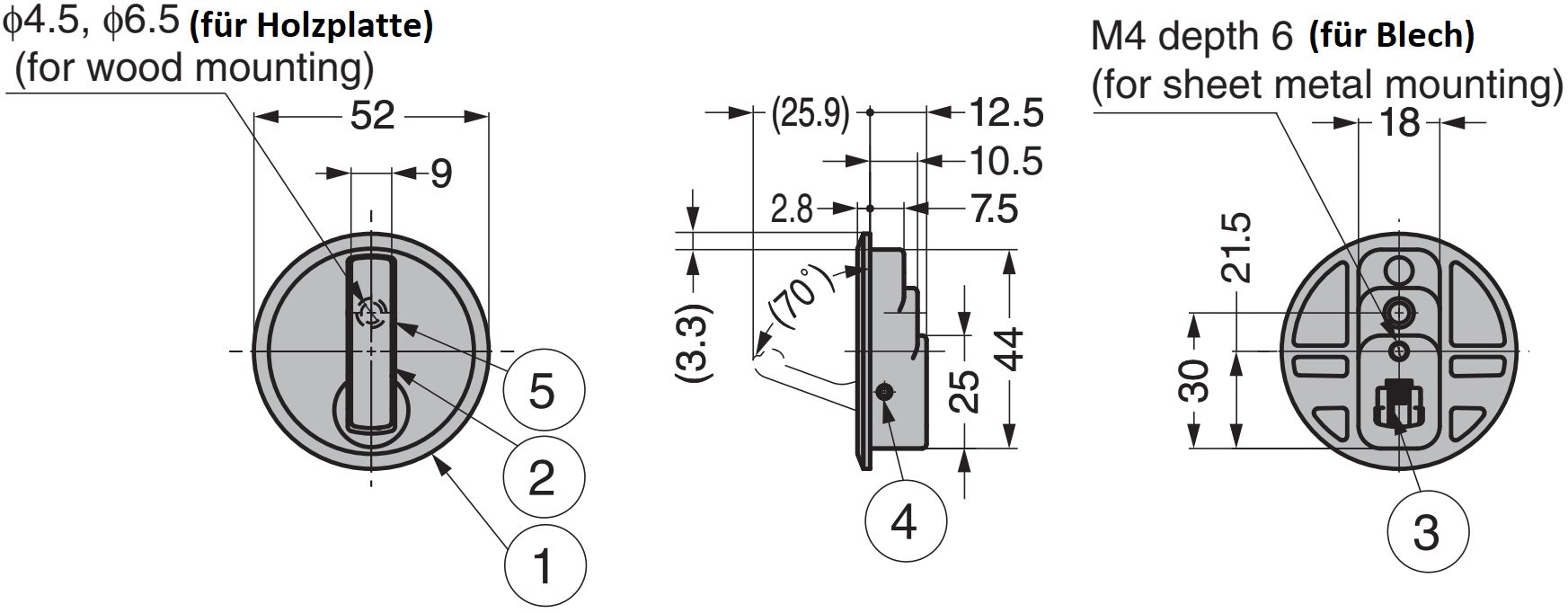 - The spring hook NF-R64-GP has a mounting hole with a diameter of ⌀4.5 mm, with countersink for mounting in wooden panel
