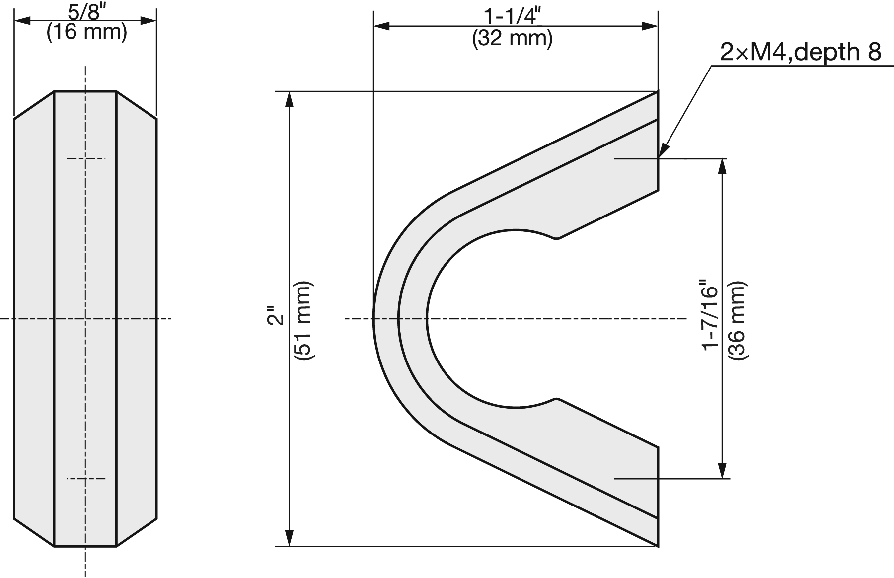 • Material thickness: 16 mm (0.63″) x 10 mm (0.4″)